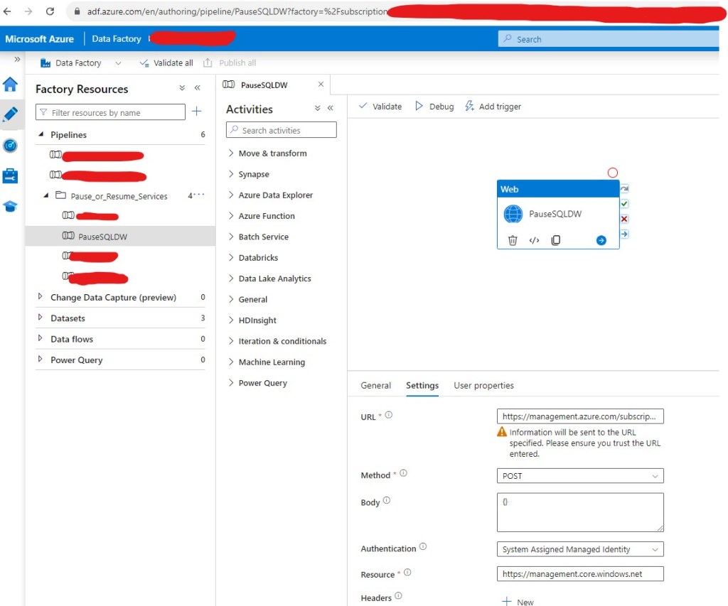 Step 3: Drag Web activity from the General Activities in the canvas and name it ‘PauseSQLDW’.