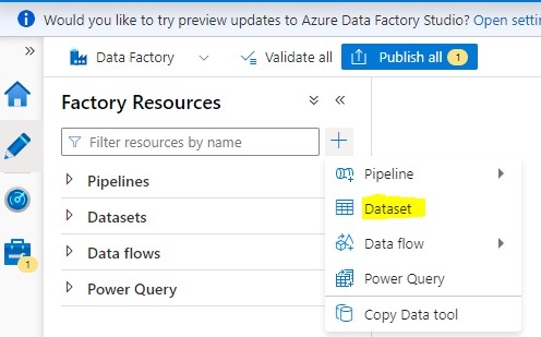 Step 14: Go to Author section of Azure Data factory and click the + sign, then select Dataset.