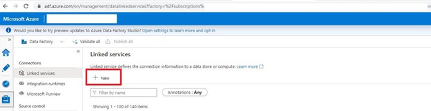 Step 11: Go to Mange page and click Linked services. Click on New.