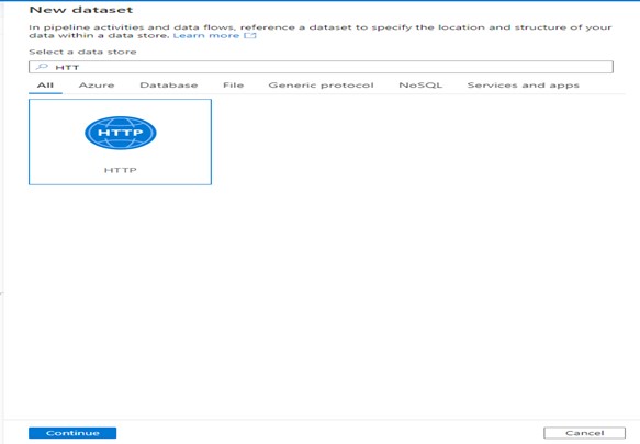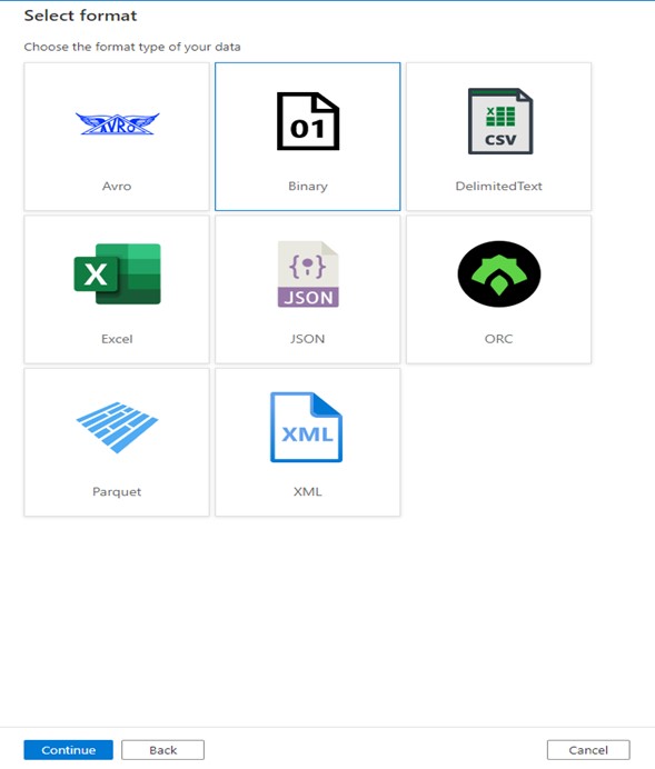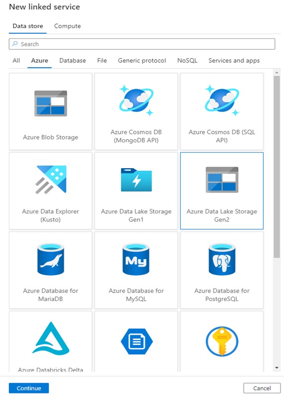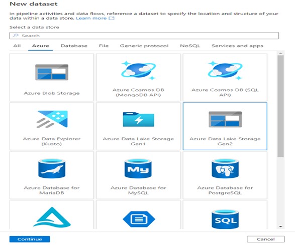 Step 15: Search and select Azure Data Lake Storage Gen2 and click Continue.