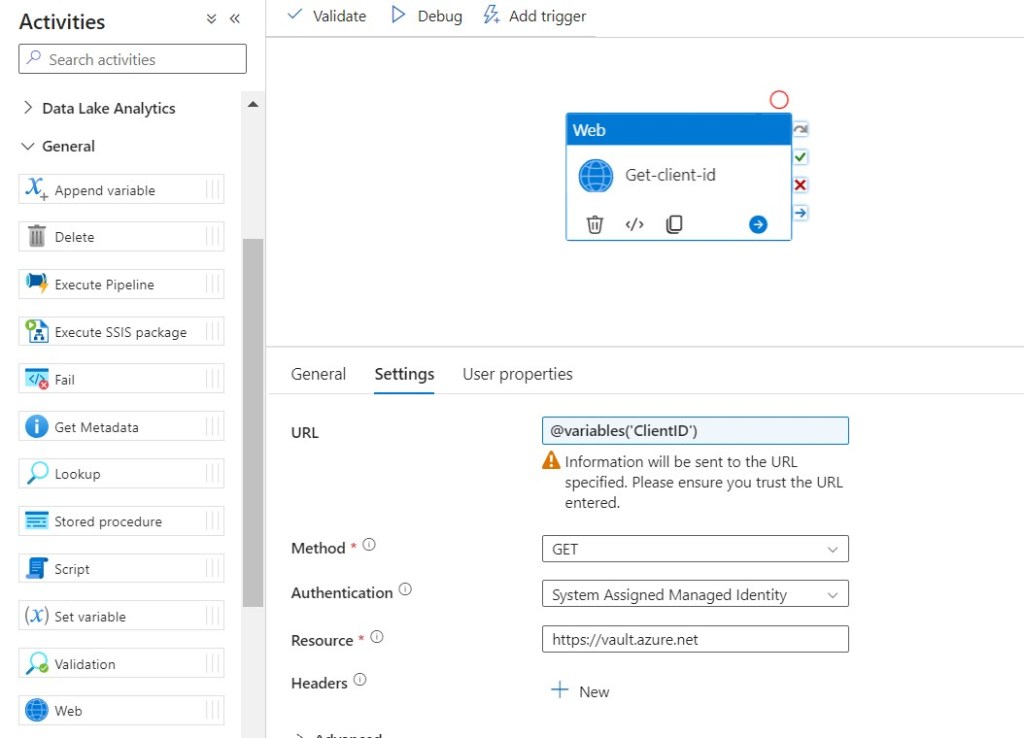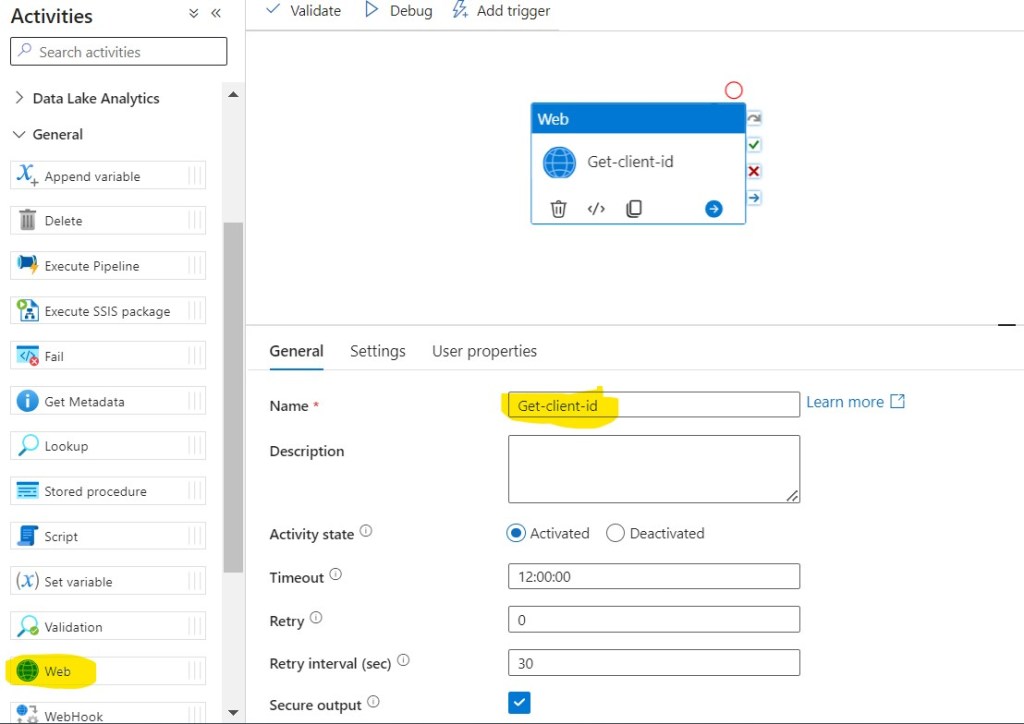 Step 24: In the Activities toolbox, expand the General category, and drag and drop the Web activity from the toolbox to the pipeline designer surface. Specify Get-client-id for Name.