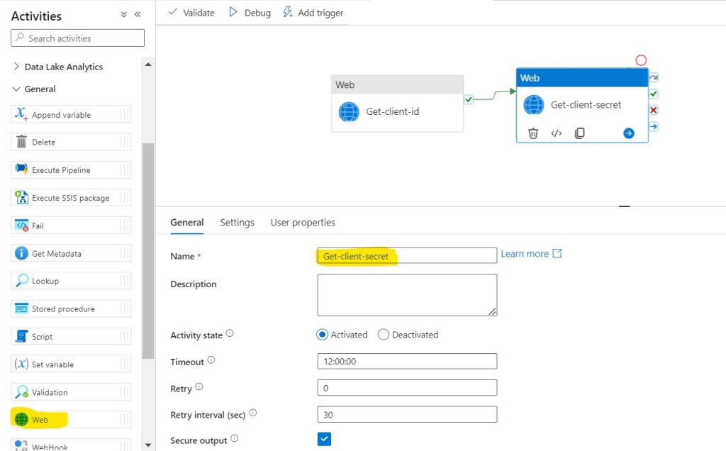 Step 26: In the Activities toolbox, expand the General category, and drag and drop the Web activity from the toolbox to the pipeline designer surface. Specify Get-client-secret for Name.