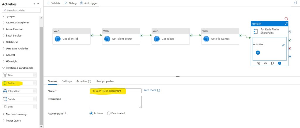 Step 32: In the Activities toolbox, expand the Iteration & conditionals category, and drag and drop the ForEach activity from the toolbox to the pipeline designer surface. Specify For Each File in SharePoint for Name.