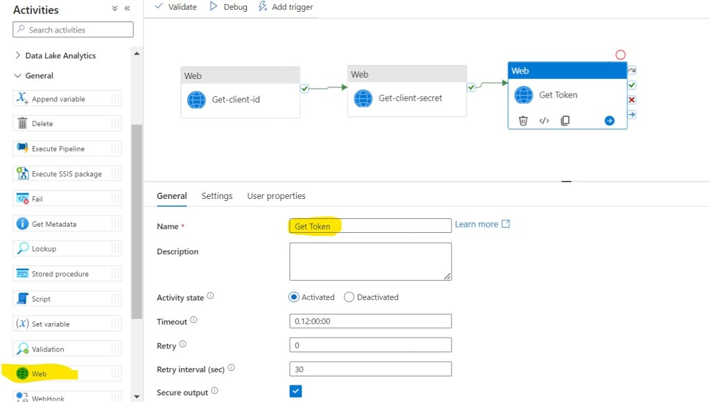 Step 28: In the Activities toolbox, expand the General category, and drag and drop the Web activity from the toolbox to the pipeline designer surface. Specify Get Token for Name.