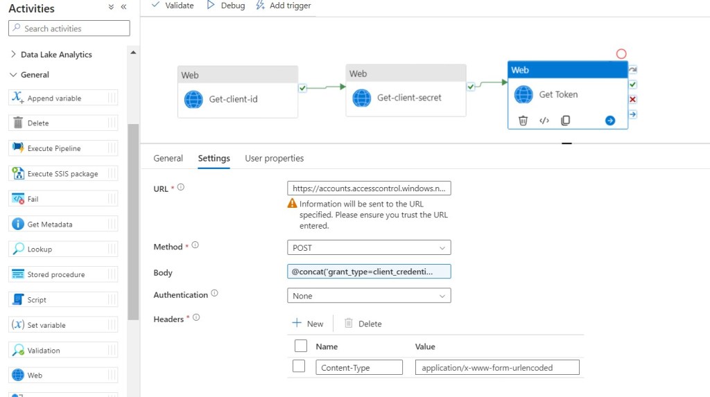 - Body: @concat(‘grant_type=client_credentials&client_id=’,activity(‘Get-client-id’).output.value,’@f704ab1a-3e34-4240-bfe5-b8fce4f8d452&client_secret=’,encodeUriComponent(activity(‘Get-client-secret’).output.value),’&resource=00000003-0000-0ff1-ce00-000000000000/ization.sharepoint.com@f704ab1a-3e34-4240-bfe5-b8fce4f8d452′)