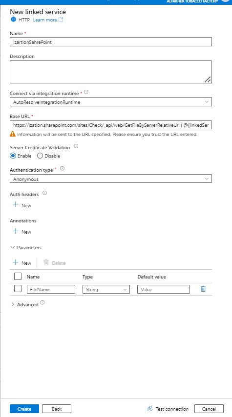 Step 4: Fill the name of the linked service, Provide the URL of the SharePoint file, choose Authentication Type as Anonymous and click Create.