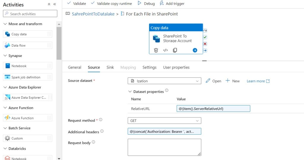 URL example: https://Ization.sharepoint.com/sites/Check/_api/web/GetFileByServerRelativeUrl (‘@{linkedService().FileName}’)/$value