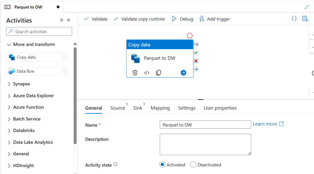 16. Search for Copy in Activities and drag the Copy Activity to the pipeline pane → Name it Parquet to DW.