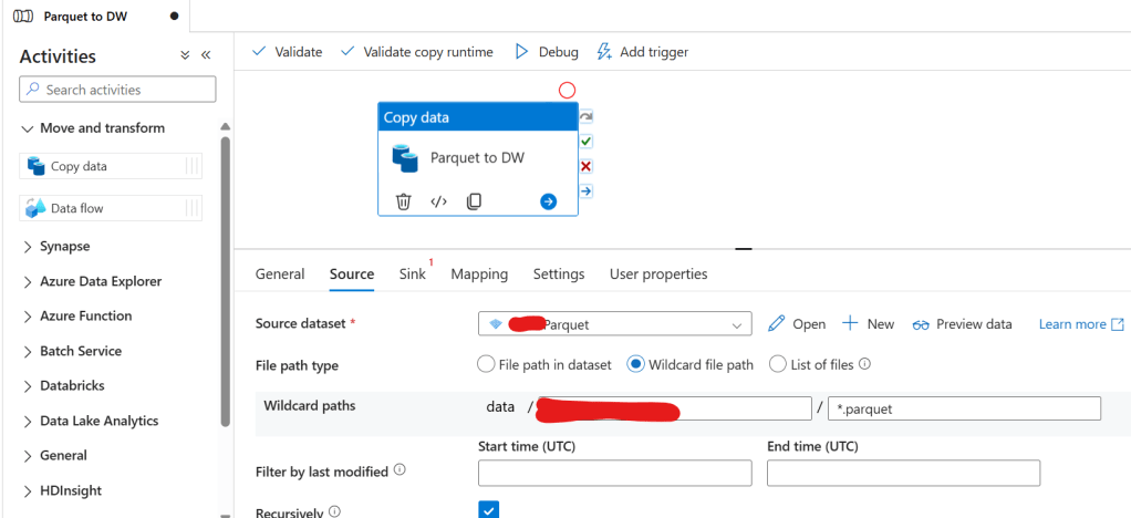 17. Select the Copy Activity, go to Source, select the Parquet Dataset, and fill in details.