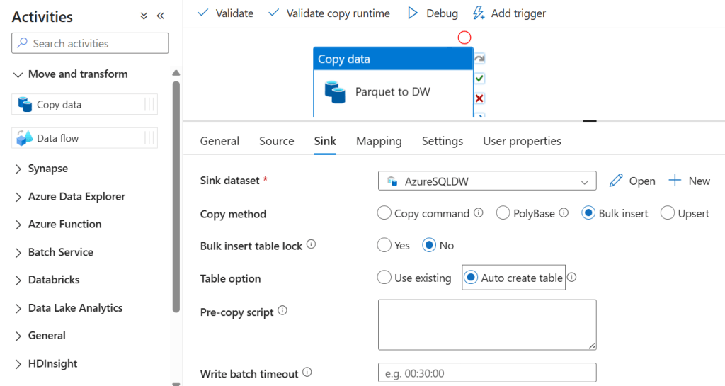 18. Go to Sink, select Azure SQL DW Dataset, and enable the Auto create table option.