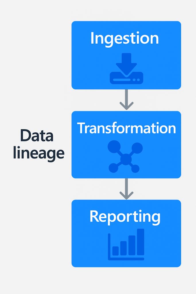 Lineage tracks how data moves and transforms from origin to destination — for example, from a transactional system → data warehouse → Power BI dashboard.