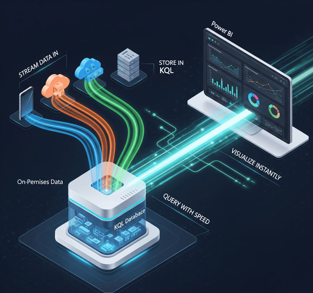 Together, they form the backbone of Fabric’s real-time analytics capability: stream data in → store in KQL → query with speed → visualize instantly.