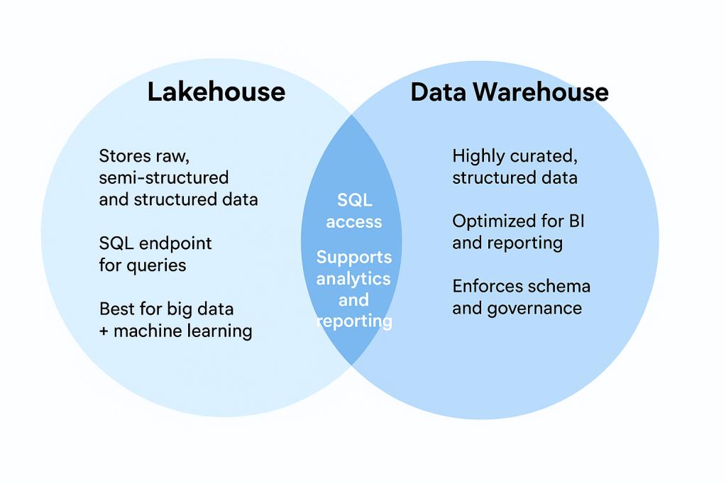 The question isn’t really Lakehouse vs. Warehouse, but rather how they complement each other. Fabric gives you both so you don’t have to choose, you can stage and experiment in the Lakehouse, then promote curated, governed data into the Warehouse for enterprise-grade analytics.