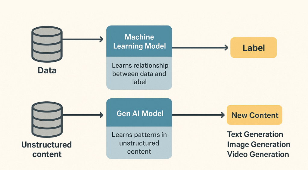 - Generative AI = Creates brand-new content inspired by patterns in data.